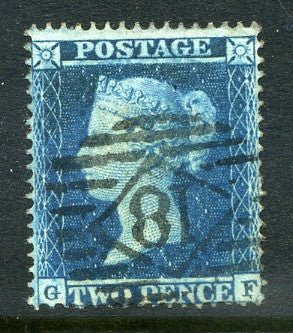 1855 2d Blue plate 5 small crown perf 16 lettered GF. A very fine used example with clean numeral cancel.